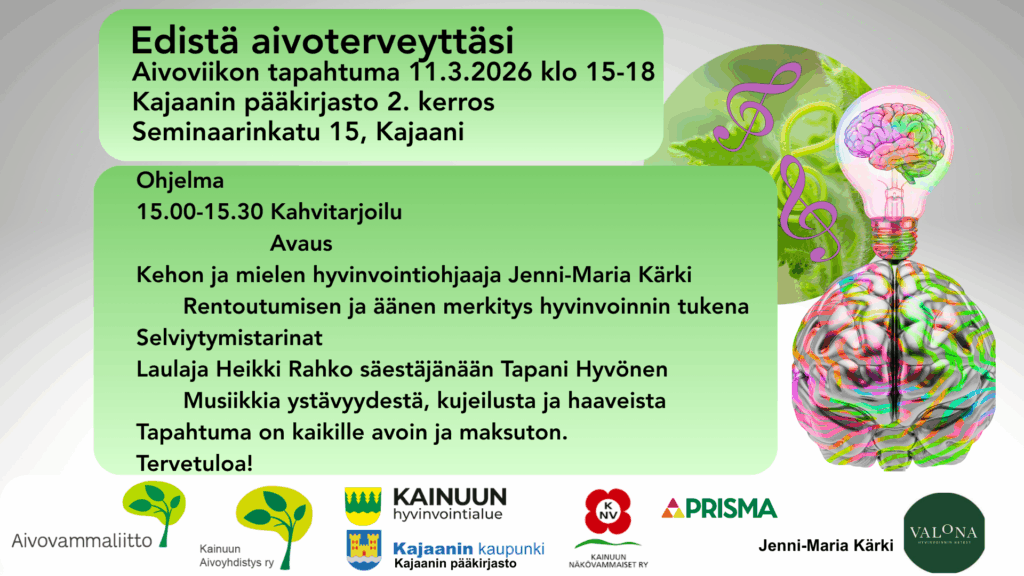Ke 11.3.2026 klo 13 Aivoviikon luento ”Aivojen ja mielen terveyttä arkeesi” Teamsissa. Luennoitsijana toimii neuropsykologian erikoispsykologi, tohtori Jaana Sarajuuri. Ilmoittautuminen ei ole pakollista, mutta ennakkoon ilmoittautuneille lähetetään muistutus ja linkki sähköpostiin.