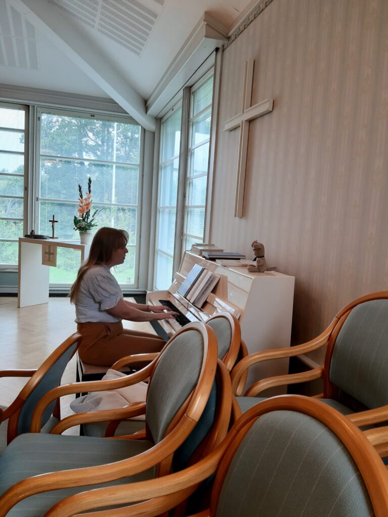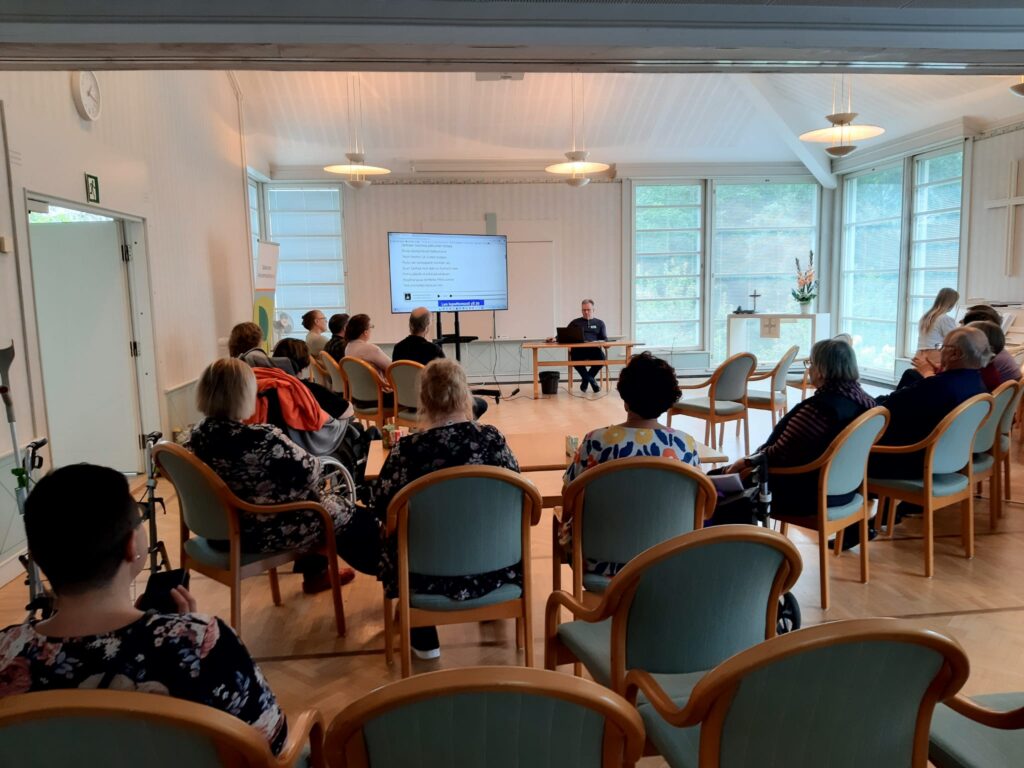 Satakunnan yhdistys vieraili Junnilan leirikeskuksella. Ensimmäinen kuva on Junnilan ankkalammelta. Toisessa kuvassa lauluhetkeä säestää Sara Pessinen. Kolmannessa kuvassa Markku Jantunen ja seurakunnan ohjaaja Minna Aro kokeilevat uudenlaisia apuvälineitä.