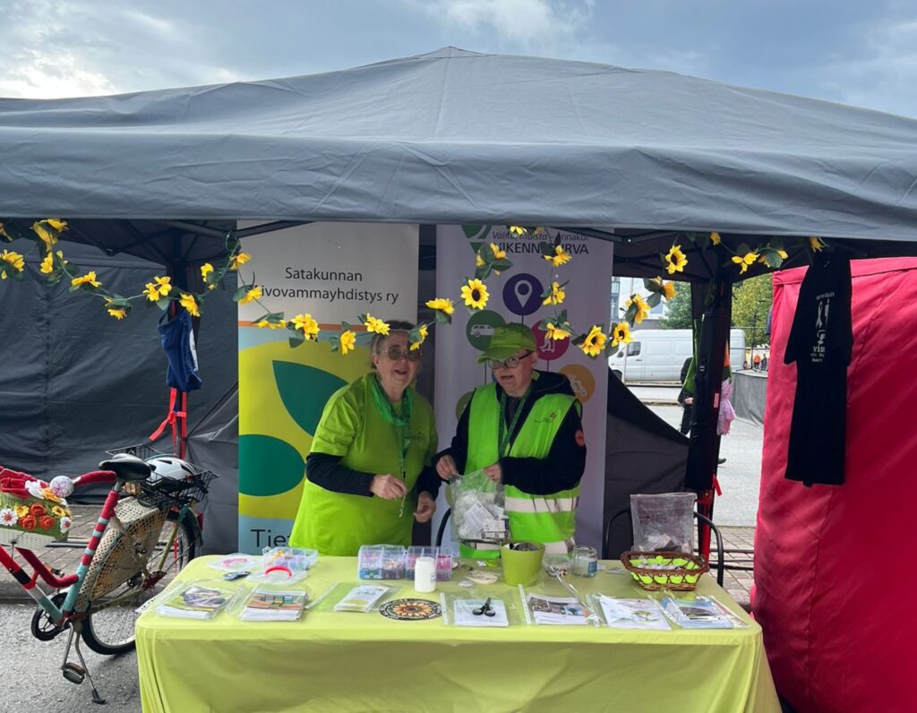 Muita aiheita, joista nostimme tietoa yhdistyksemme puolesta, oli SataNeuro-yhteistyö ja auringonkukkasymboli. Näimme omia mutta myös muiden neurologisten yhdistysten jäseniä markkinoilla, ja heidän kanssaan keskustelimme mahdollisuuksista osallistua yhteisiin tapahtumiin ja liikuntaryhmiin koko Satakunnassa. Monelle meistä tuli uutena tietona auringonkukan tarkoittavan näkymättömien vammojen ja sairauksien symbolia. Tulemme tiedottamaan siitä tulevissa tapahtumissa. Keskustelimme tulevasta myös AVH-yhdistyksen jäsenten kanssa Aivovammaliiton alaisuudessa.